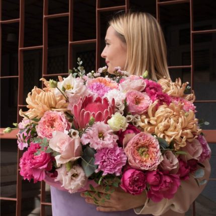 Большой букет из 151 красной и розовой розы «Преданное сердце» в дизайнерской коробке