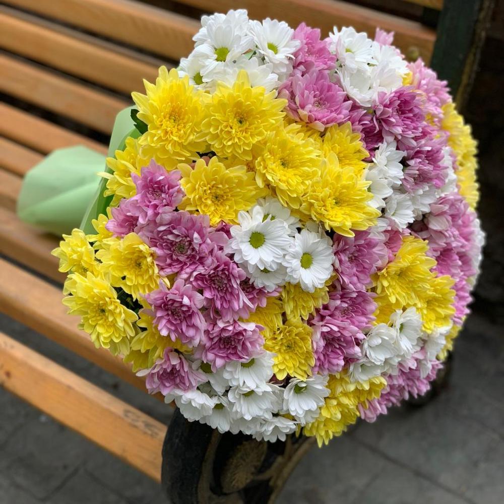 Прекрасный, большой букет из разноцветных хризантем в стильном оформлении.