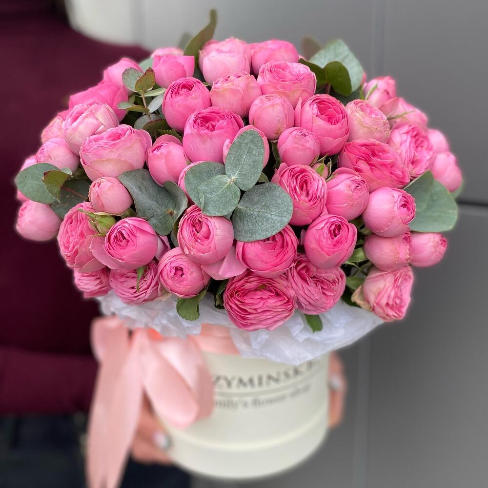 В шляпную коробку наши флорист вставляют мокрую губку -(оазис), а затем флористы вставляют кустовую розу.