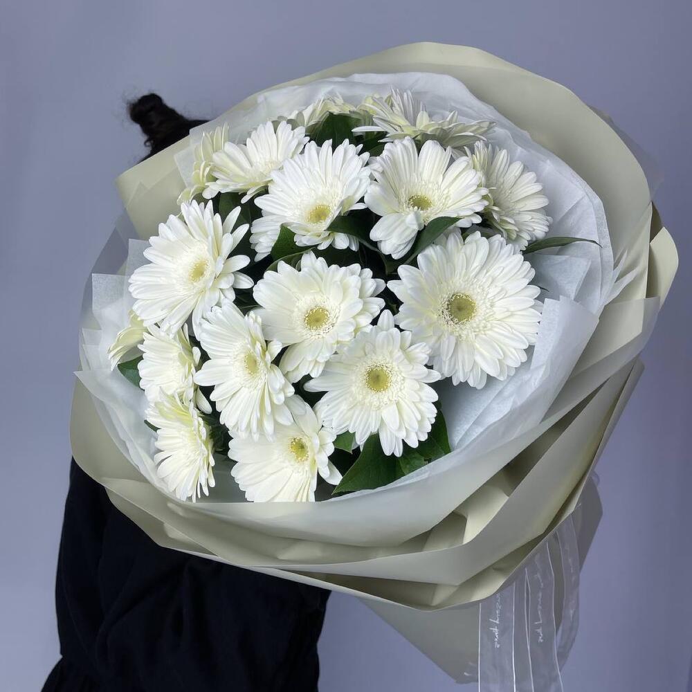Гербера белая – 17 шт.Салал пучок – 1 шт.Пленка матовая – 8 шт.Тишью белое – 2 шт.
