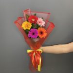 Рускус – 6 шт.Лента атласная – 1 шт.Гербера мини – 5 шт.Упаковка дизайнерская – 1 шт.