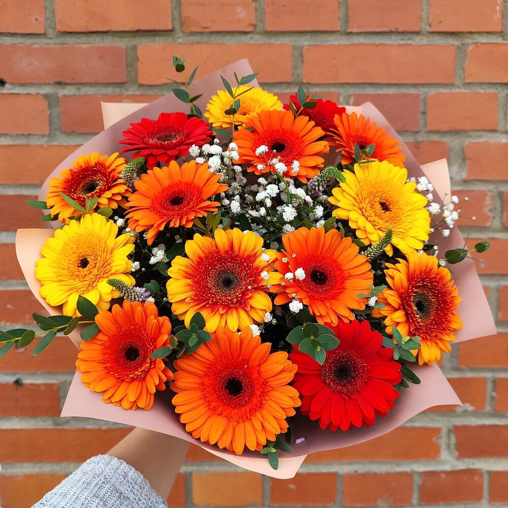 Гербера мини – 15 шт.Вероника – 4 шт.Гипсофила – 1 шт.Фисташка пучок – 2 шт.Эвкалипт пучок – 1 шт.Упаковка дизайнерская – 1 шт.