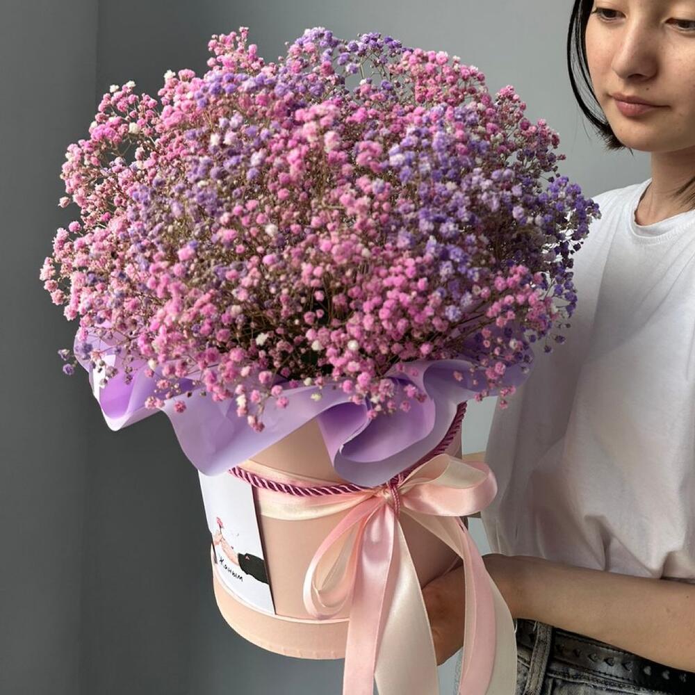 “Сиреневый туман” – композиция из гипсофилы в шляпной коробке