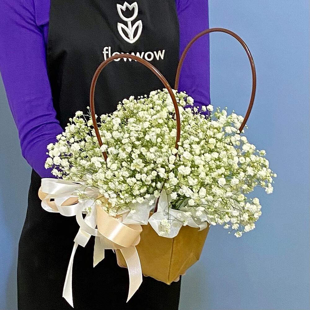 Гипсофила – 3 шт.Лента атласная – 2 шт.Сумочка – 1 шт.