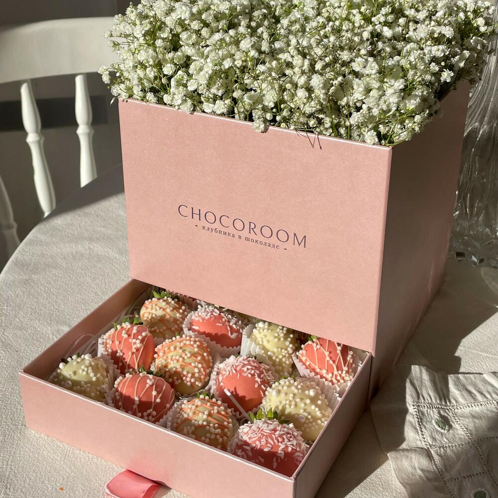 Шкатулка «Пинк» с клубникой в шоколаде и гипсофилой – 16 ягод и 7 гипсофил
