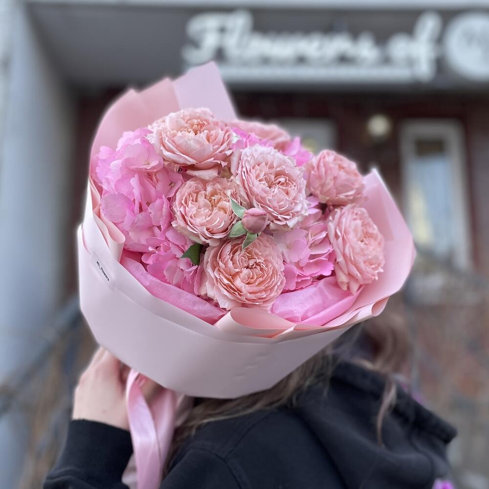 Букет из гортензии и кустовой пионовидной розы Juliet