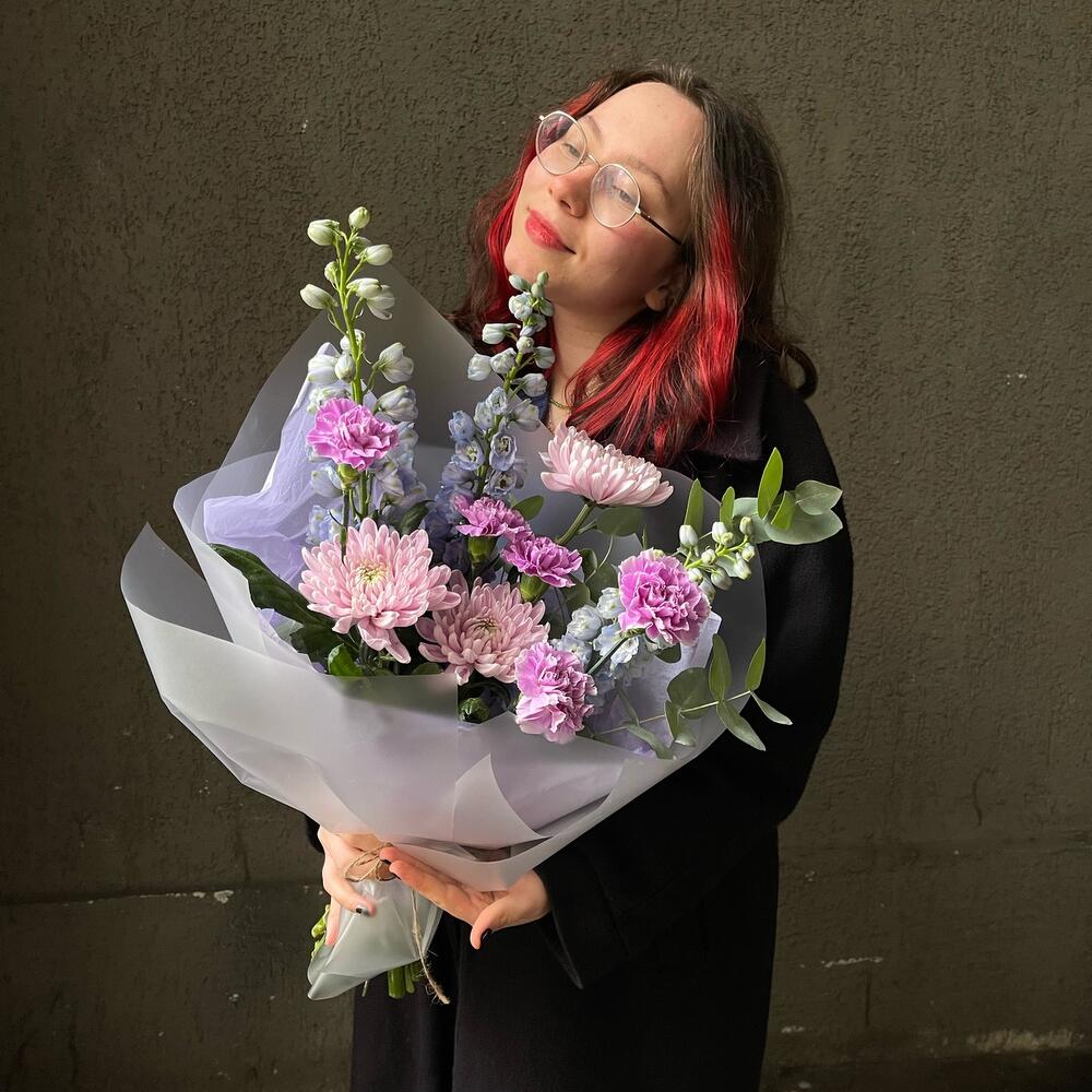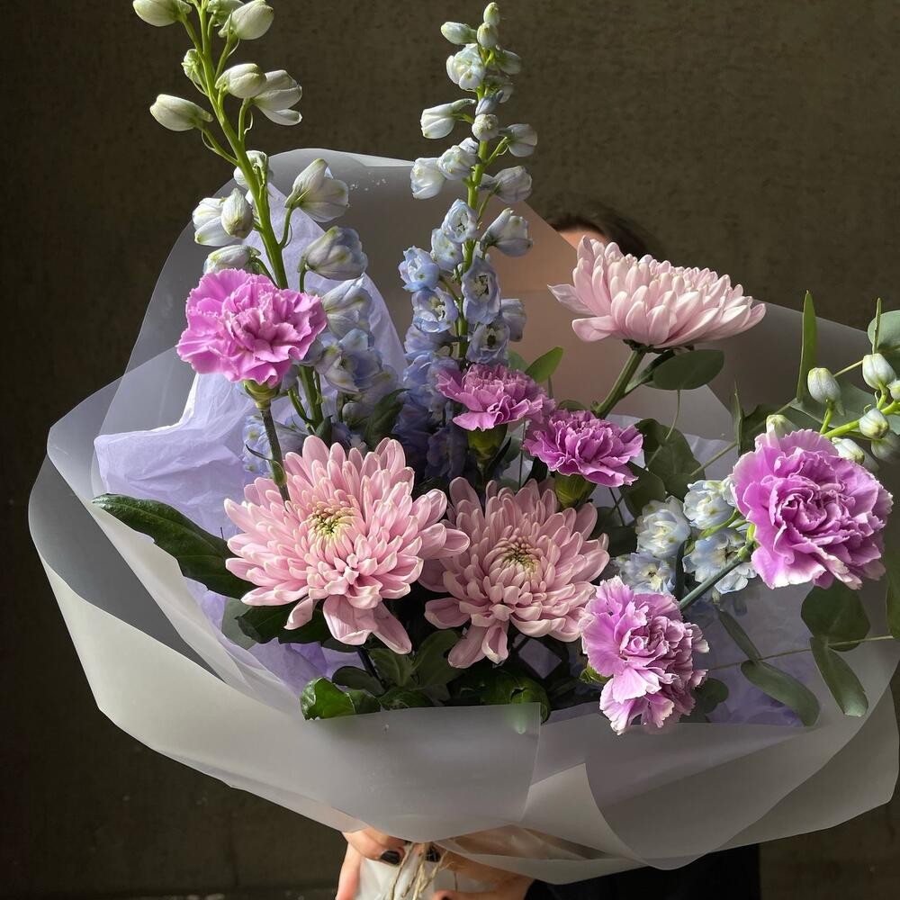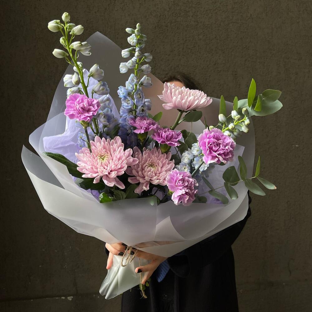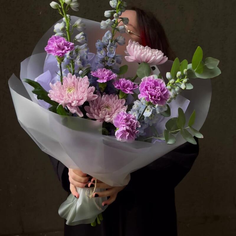 Дельфиниум – 3 шт.Эвкалипт – 2 шт.Хризантема – 3 шт.Гвоздика – 5 шт.Упаковка дизайнерская – 3 шт.