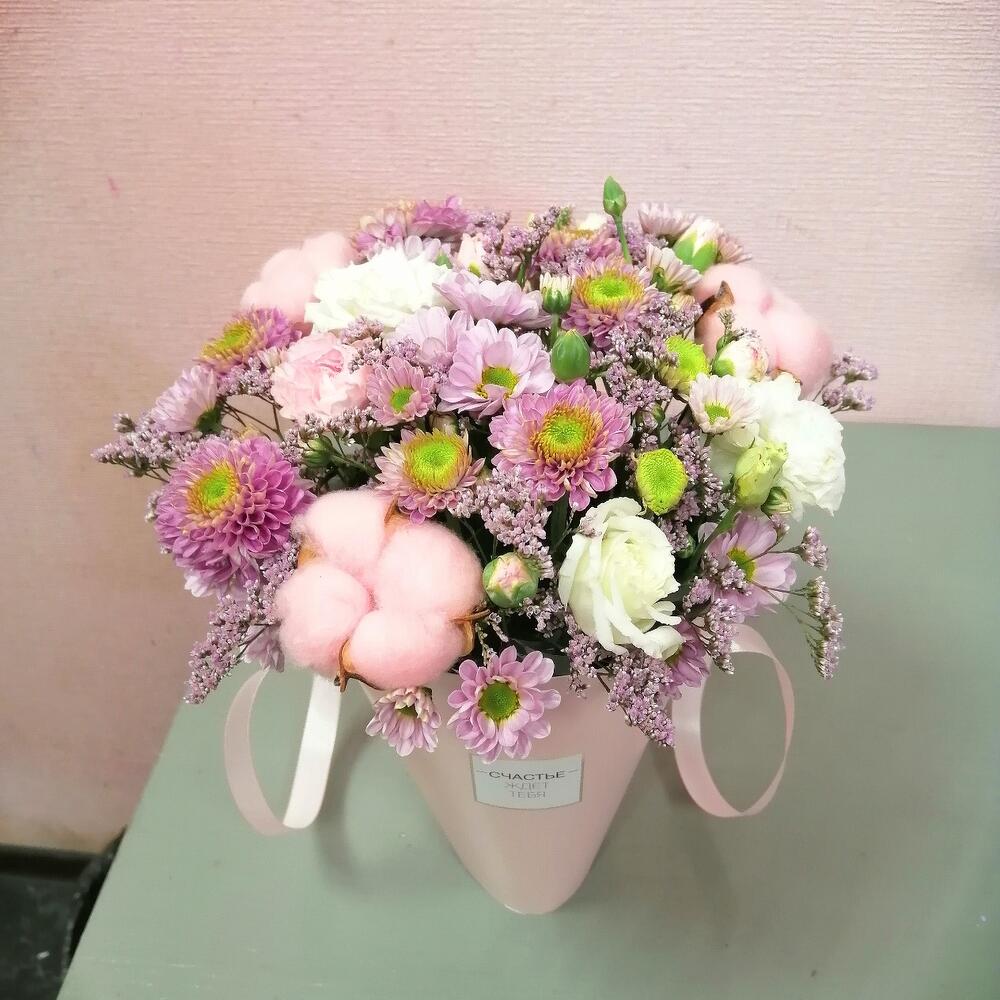 Цветы в коробке из роз ,диантуса ,хлопка ,эустомы