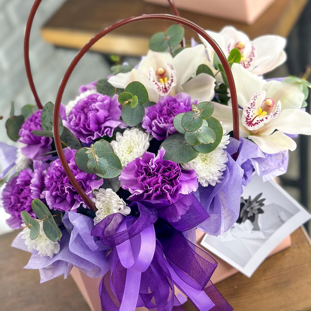 Орхидея Цимбидиум – 3 шт.Эвкалипт – 1 шт.Сантини – 3 шт.Открыточка с вашими пожеланиями – 1 шт.Оазис флористический – 1 шт.Средство для продления жизни цветов – 1 шт.Сумочка с ручками из плотного картона ламинированого – 1 шт.Диантус сортовой – 7 шт.инструкция по уходу за цветами – 1 шт.