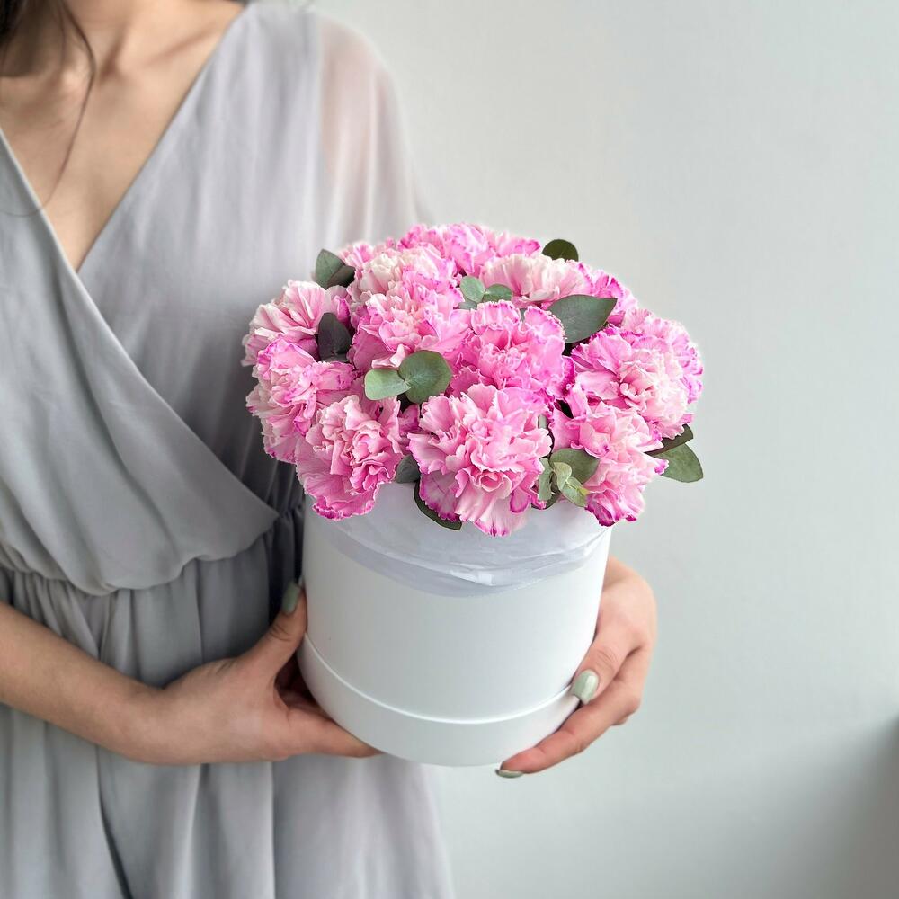 Шляпная коробка с ярко-розовой гвоздикой и эвкалиптом, небольшого размера, 20 см в диаметре и 25 см высотой