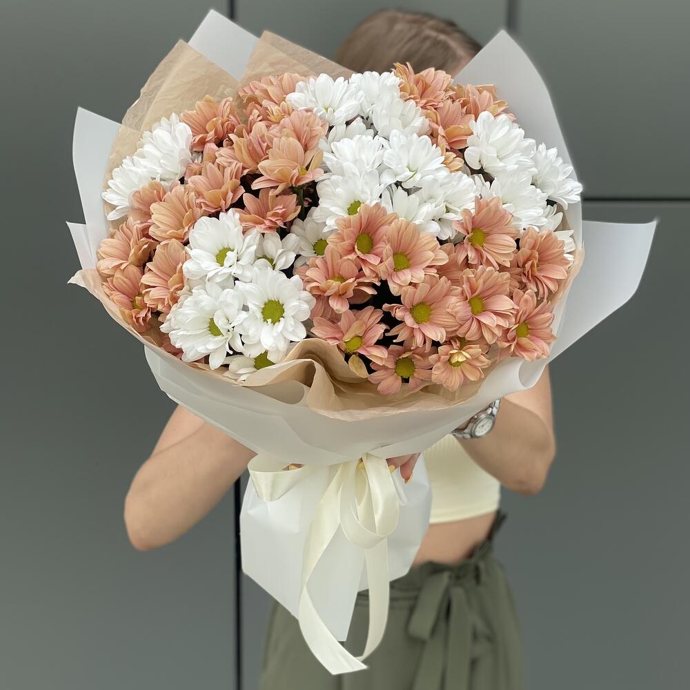 Букет из персиковой и белой ромашковой хризантемы в оформлении!