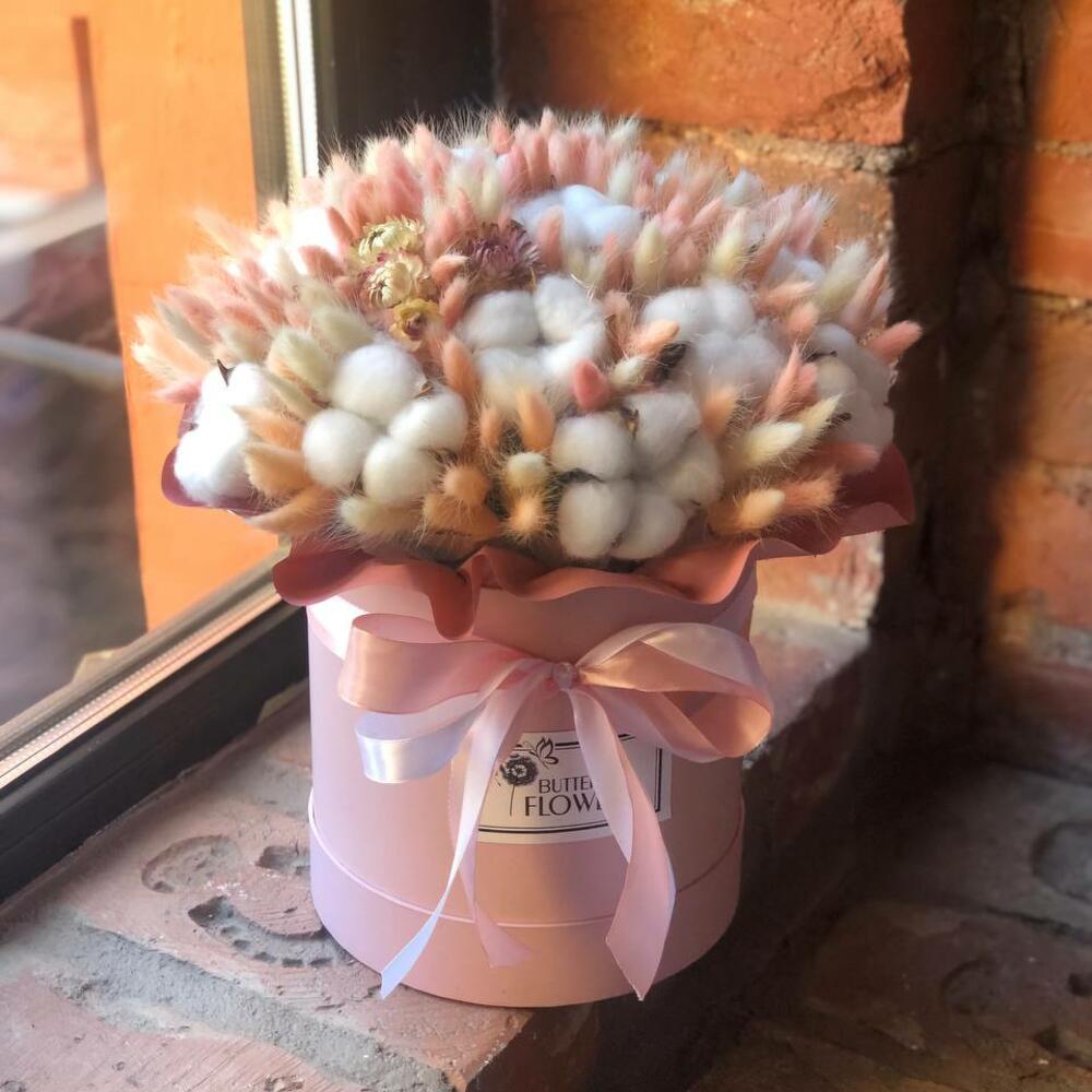 Букет из сухоцветов - лагуруса, хлопка и стабилизированной розы в шляпной коробке «Ирма»
