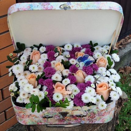 Хризантемы и Пионовидные кустовые розы в коробке + открытка ручной работы в подарок