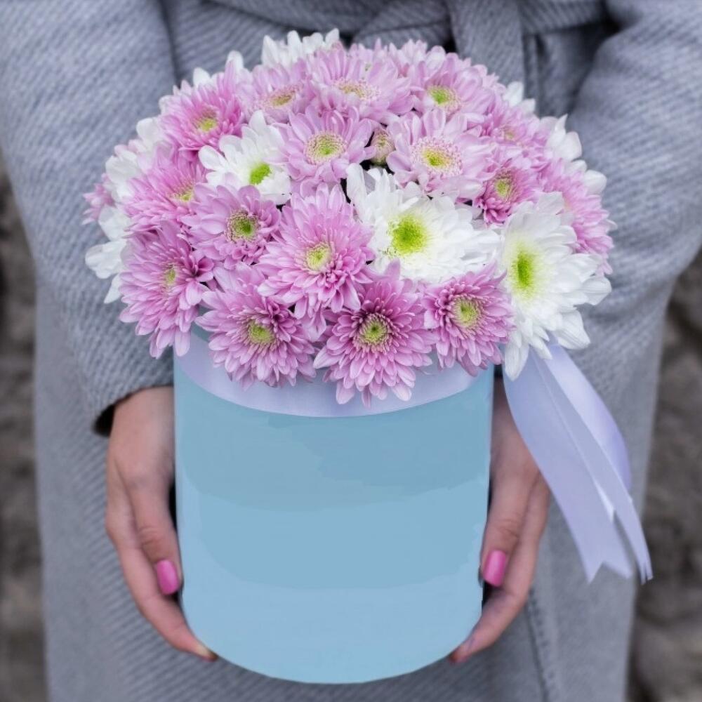 Хризантема – 25 шт.Оазис флористический – 1 шт.шляпная коробка в ассортименте – 1 шт.