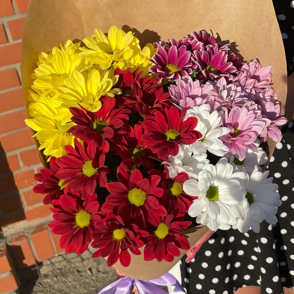 Хризантема кустовая – 5 шт.Лента атласная – 1 шт.Упаковка дизайнерская – 1 шт.