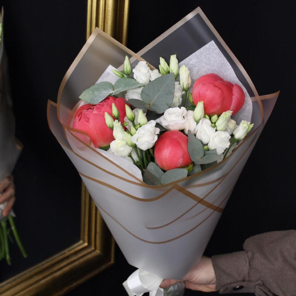 Эвкалипт – 2 шт.Пленка матовая – 2 шт.Тишью белое – 1 шт.Пион коралл шарм – 3 шт.эустома розита вайт – 3 шт.