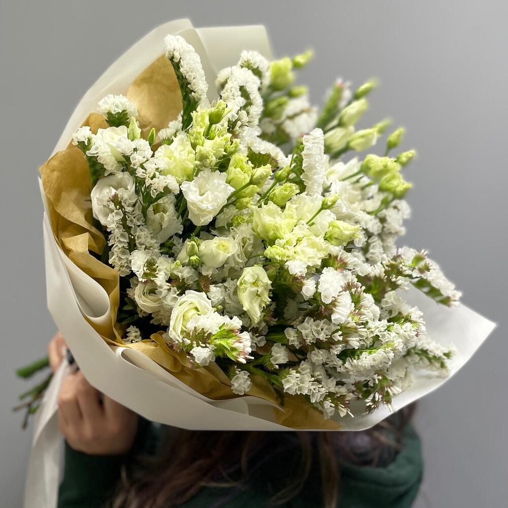 Статица – 3 шт.Эустома – 5 шт.Фисташка – 3 шт.Упаковка дизайнерская – 1 шт.