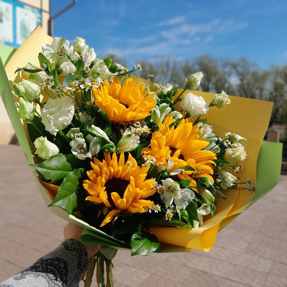 Категории: Альстромерии, Лизиантусы, Подсолнухи, Ромашки