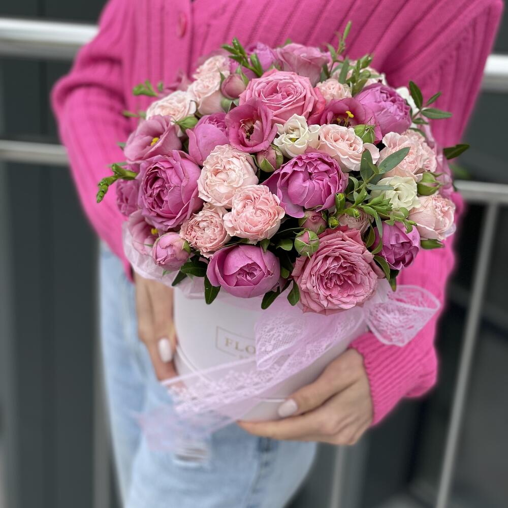 Коробка Валенсия с кустовыми пионовидными розами и эустомой