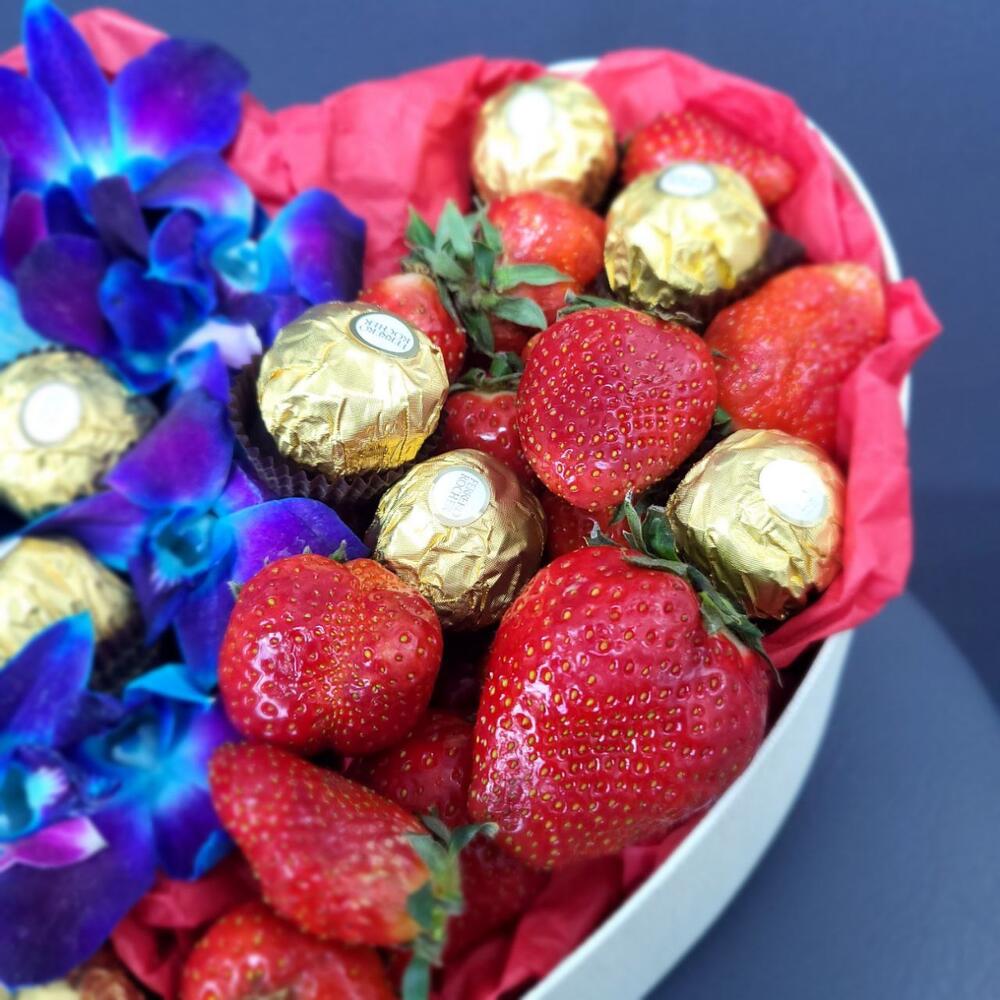 Съедобный букет из фруктов, винограда, конфет, кустовых роз, ягод и орхидей в дизайнерской коробке "Тропический вальс"