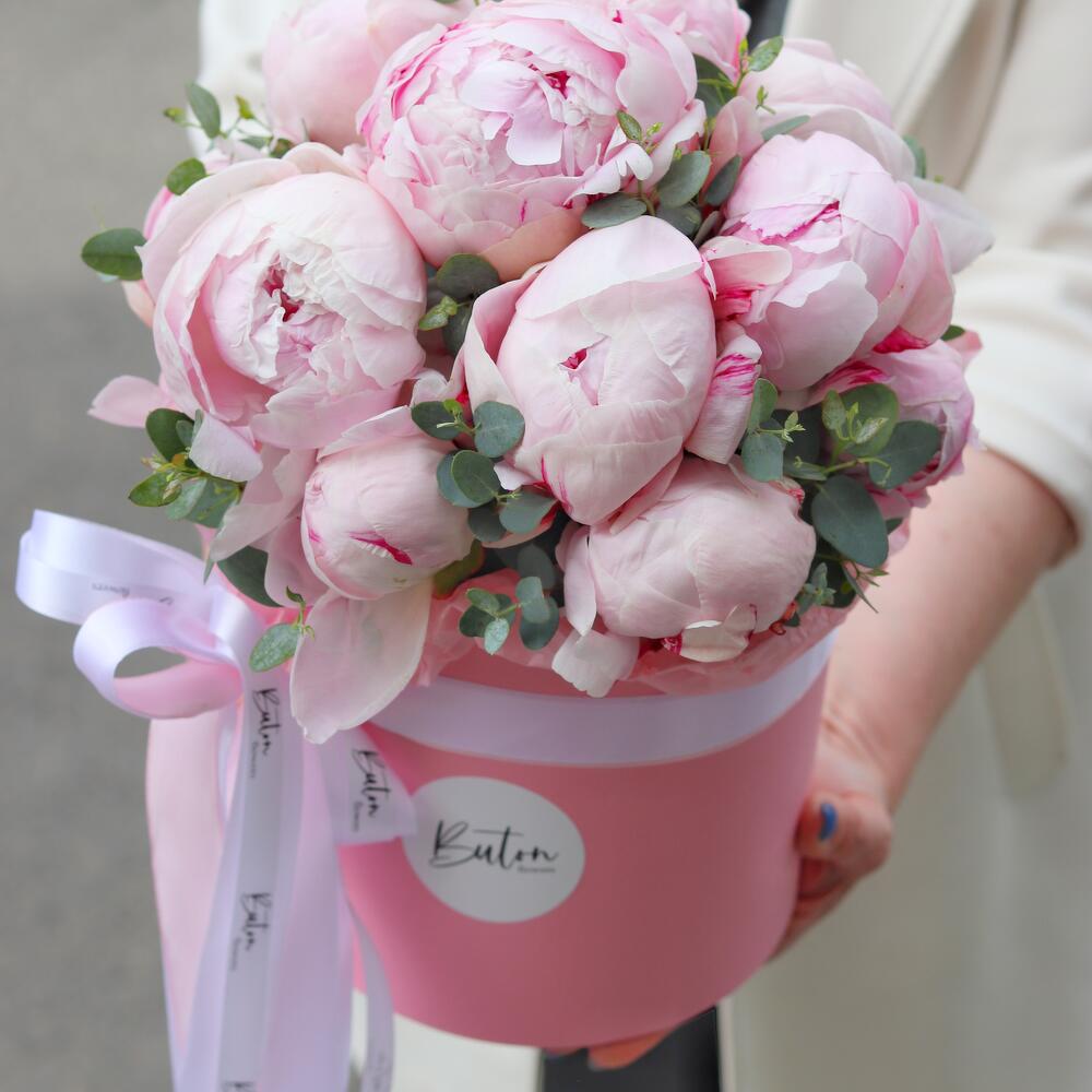 Цветы в коробке: нежные пионы с эвкалиптом