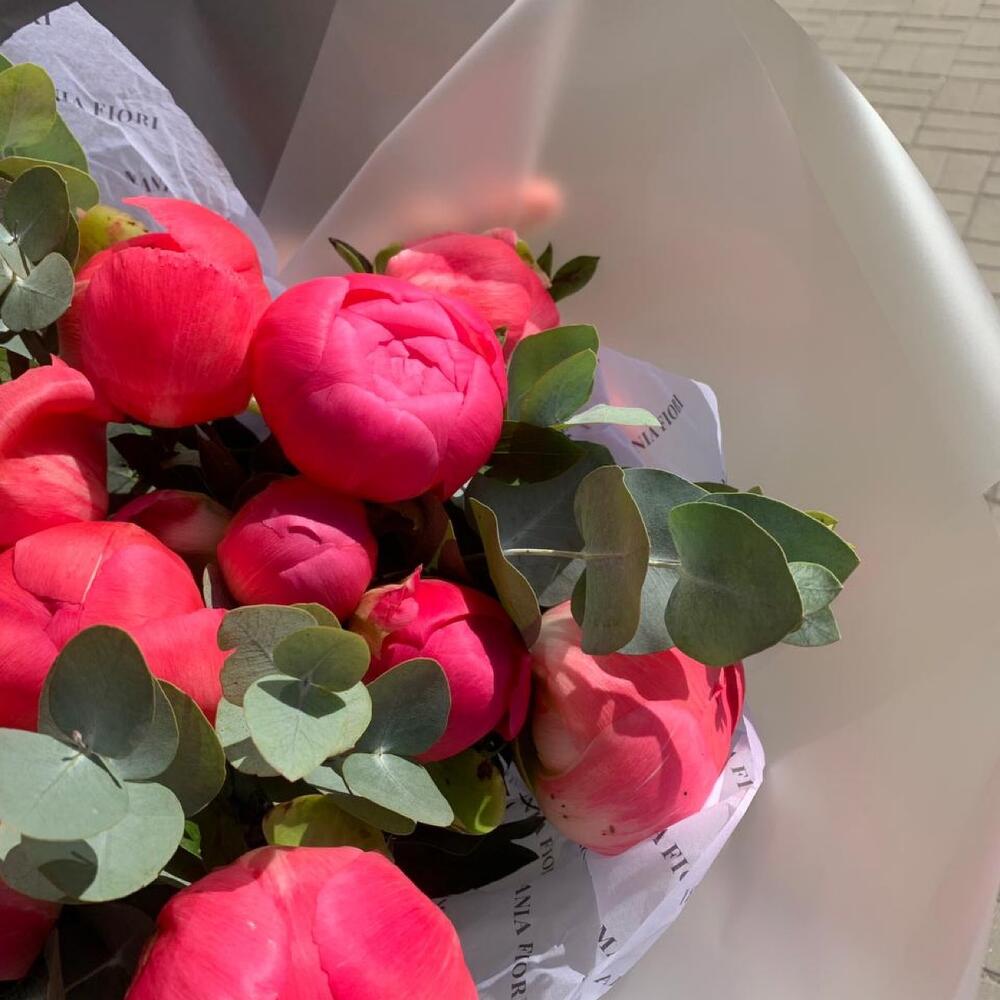Яркий букет из эффектных пионов Coral sunset, которые потрясающе раскрываются и меняют цвет от ярко кораллового до нежно персикового