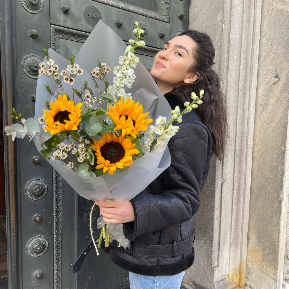 Ваксфлауэр – 2 шт.Дельфиниум – 2 шт.Эвкалипт – 2 шт.Подсолнух – 3 шт.Упаковка дизайнерская – 2 шт.