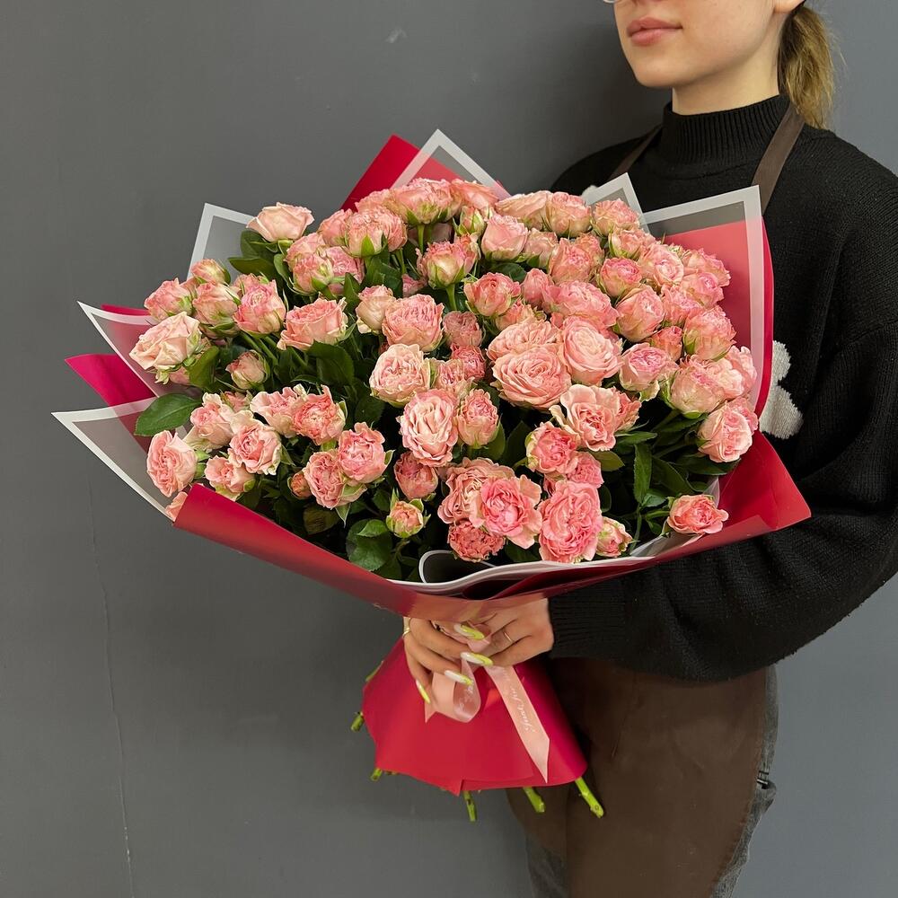 Атласная лента – 1 шт.Пионовидная кустовая роза – 29 шт.Дизайнерская упаковка – 1 шт.
