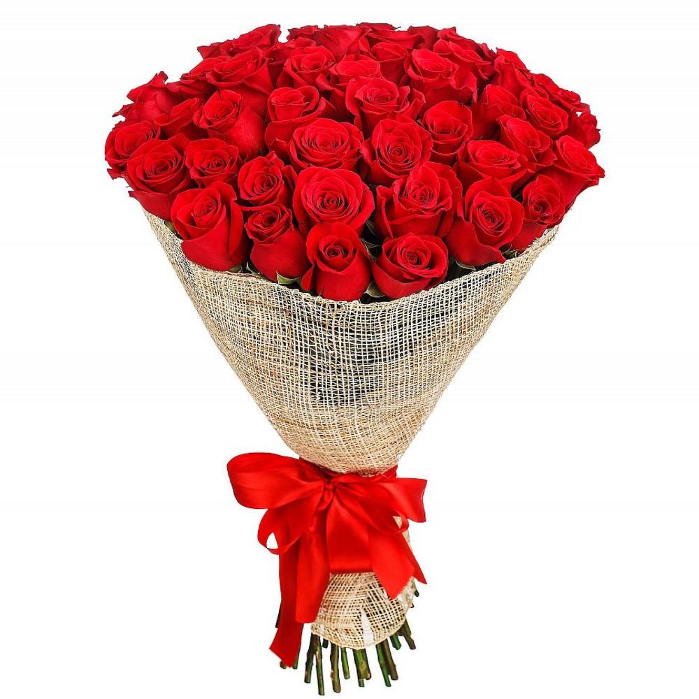 Атласная лента – 1 шт.Сетка – 1 шт.Красная роза 50 см – 51 шт.