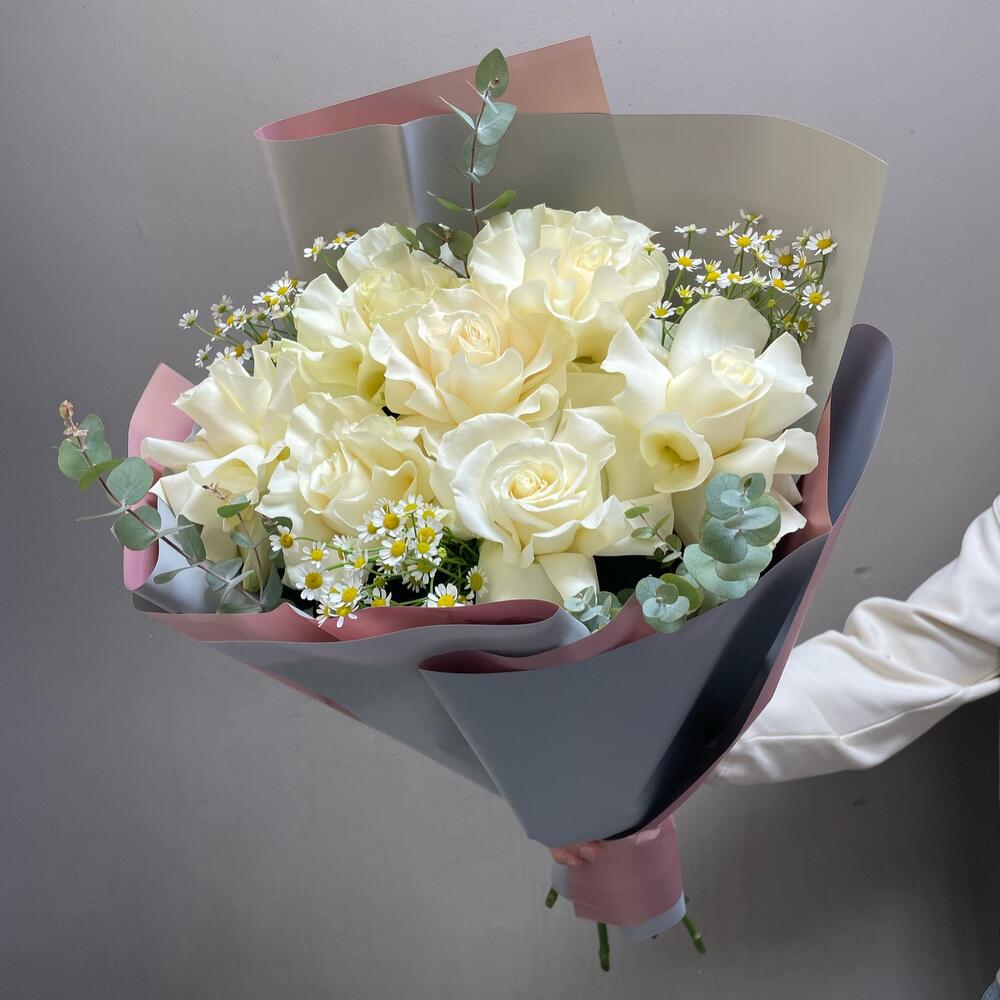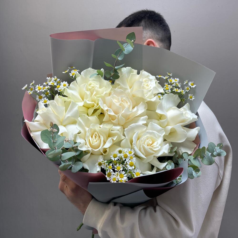 Эвкалипт – 2 шт.Лента атласная – 1 шт.Матрикария – 3 шт.Упаковка дизайнерская – 1 шт.Французская роза – 7 шт.