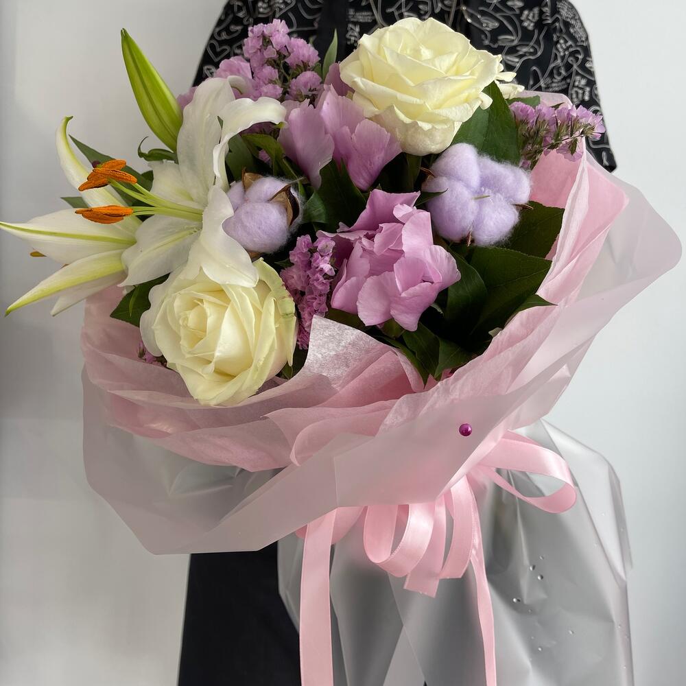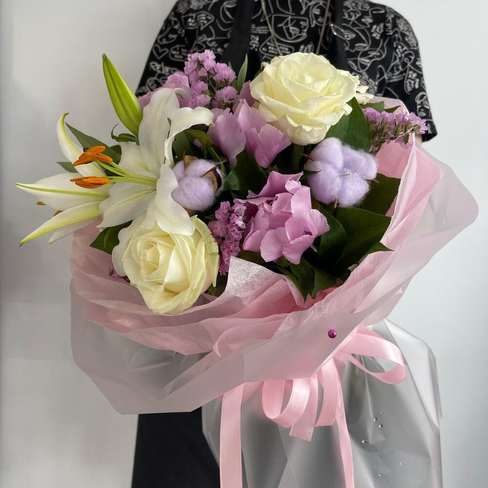 Лилия – 1 шт.Роза – 3 шт.Пион – 3 шт.Статица – 2 шт.Салал – 4 шт.Хлопок – 2 шт.