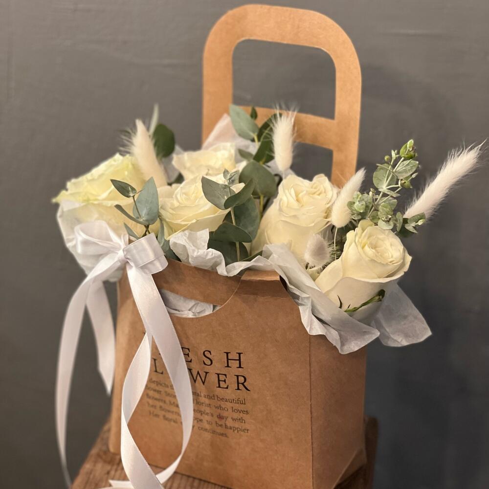 Роза белая – 5 шт.Эвкалипт – 7 шт.Лагурус (сухоцвет) – 5 шт.Оазис флористический – 1 шт.Пленка дизайнерская – 1 шт.Тишью белое – 2 шт.Лента атласная – 2 шт.работа флориста – 1 шт.