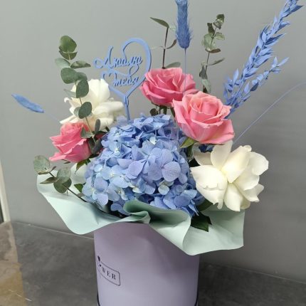 французские розы – 5 шт. Эвкалипт – 2 шт. открытка с вашими пожеланиями – 1 шт.