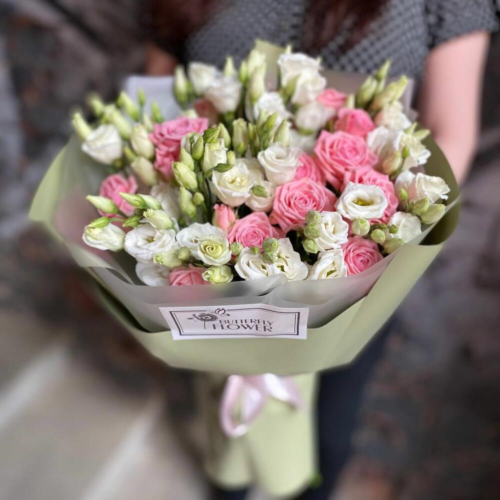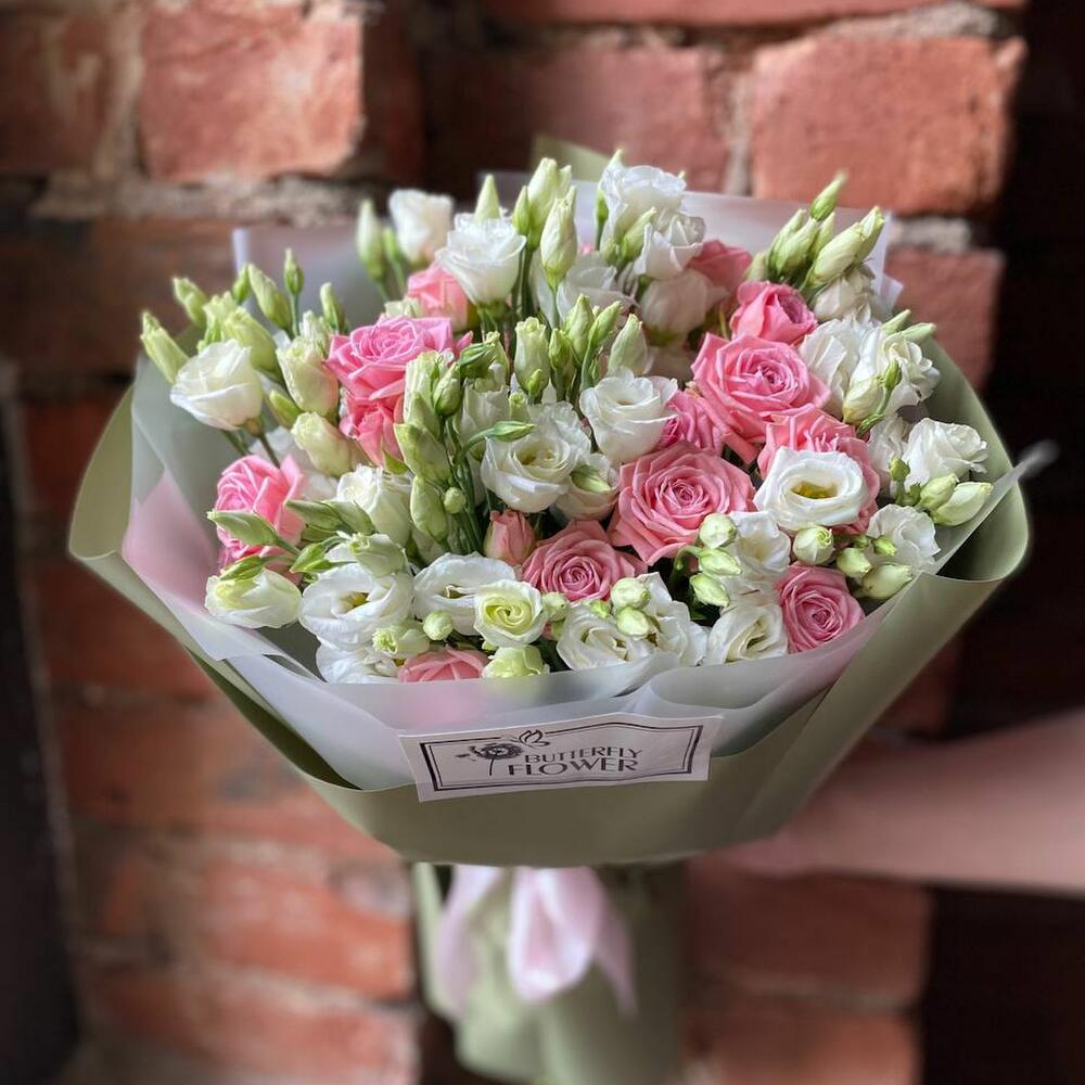Букет из белой эустомы и кустовой пионовидной розы в дизайнерской упаковке “Бомбастик”