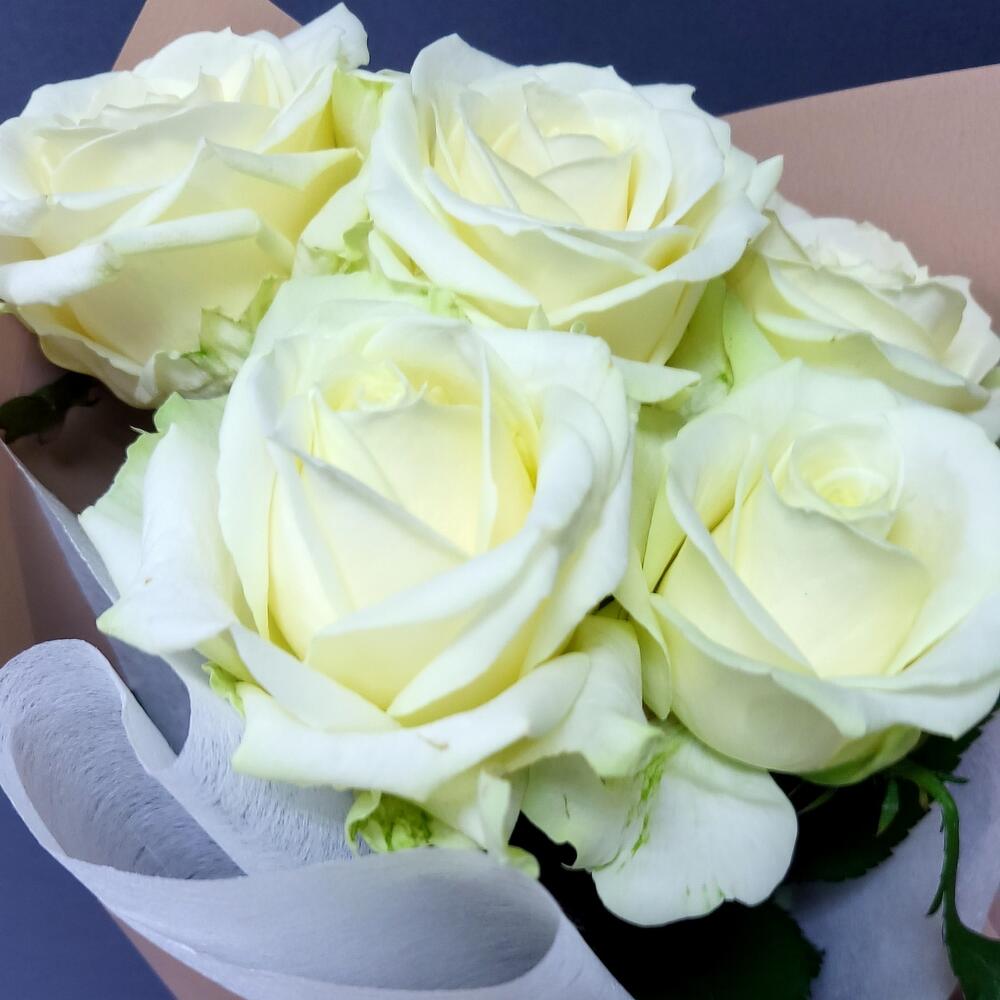 Эвкалипт – 2 шт.Лента атласная – 2 шт.Роза белая – 5 шт.Упаковка дизайнерская – 1 шт.
