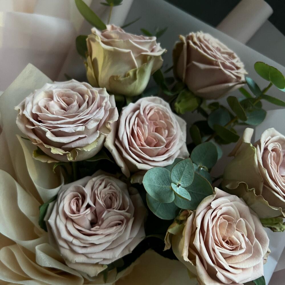 Одноголовая роза – 7 шт.Эвкалипт – 4 шт.декоративная упаковка – 1 шт.Атласная лента – 1 шт.