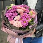 Хризантема – 3 шт. Эустома – 1 шт. Кустовая роза – 4 шт. Писташ – 2 шт. Оформление – 1 шт.