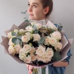 Роза кустовая – 9 шт.Упаковка дизайнерская – 2 шт.Лента органза – 1 шт.Открыточка с вашими пожеланиями – 1 шт.Эвкалипт Baby Blue – 3 шт.