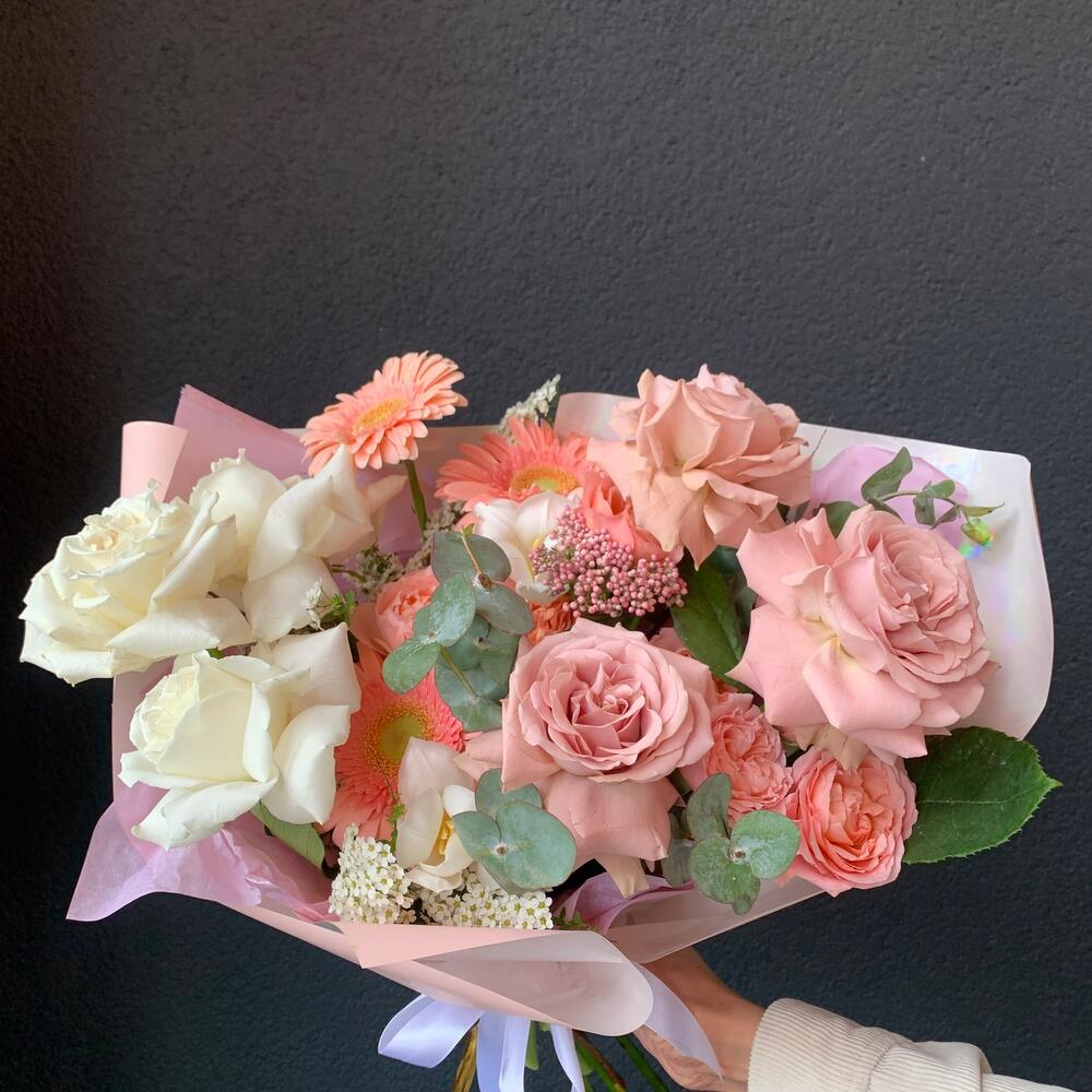 Пионовидная роза – 6 шт.Гербера – 3 шт.Тюльпан – 3 шт.Кустовая роза – 2 шт.Озотамнус – 1 шт.Эвкалипт – 3 шт.декоративная упаковка – 1 шт.Атласная лента – 1 шт.