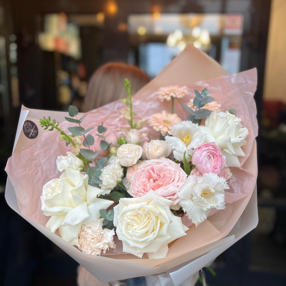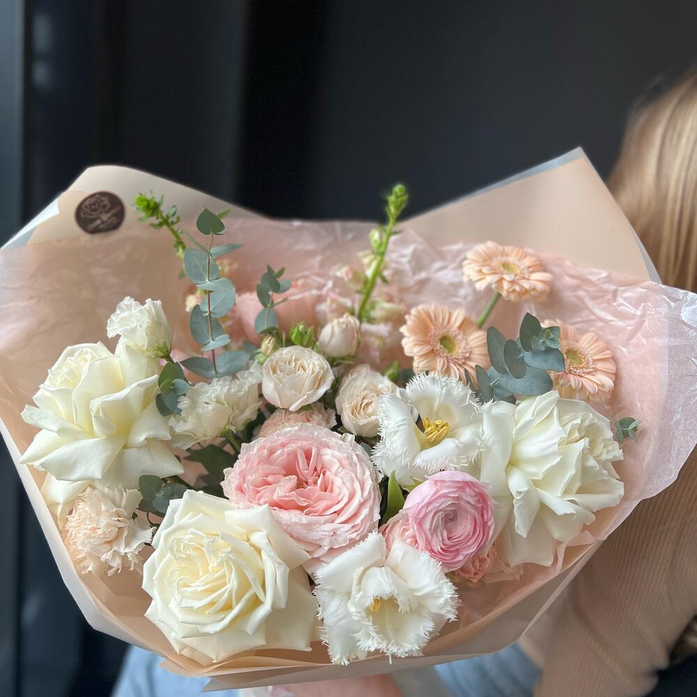 Пионовидная роза – 5 шт.Кустовая роза – 1 шт.Гербера – 3 шт.Диантус – 3 шт.Ранункулюс – 1 шт.Эустома – 1 шт.антиринум – 2 шт.тюльпаны – 2 шт.Эвкалипт – 1 шт.декоративная упаковка – 1 шт.Атласная лента – 1 шт.