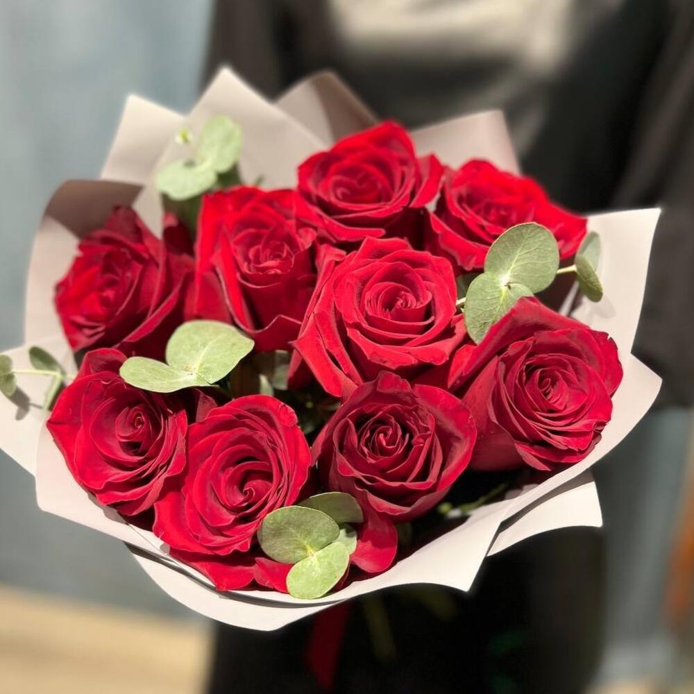 Эвкалипт – 3 шт.Лента атласная – 2 шт.Упаковка дизайнерская – 2 шт.бордовые эквадорских розы – 9 шт.