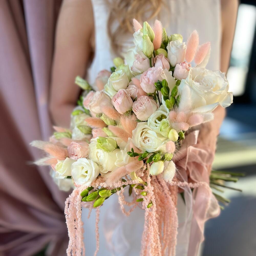Пионовидная роза – 5 шт.Кустовая пионовидная роза – 11 шт.Лизиантус – 5 шт.фрезии – 5 шт.Лагурус – 30 шт.амарант стабилизированный – 1 шт.Лента атласная – 3 шт.