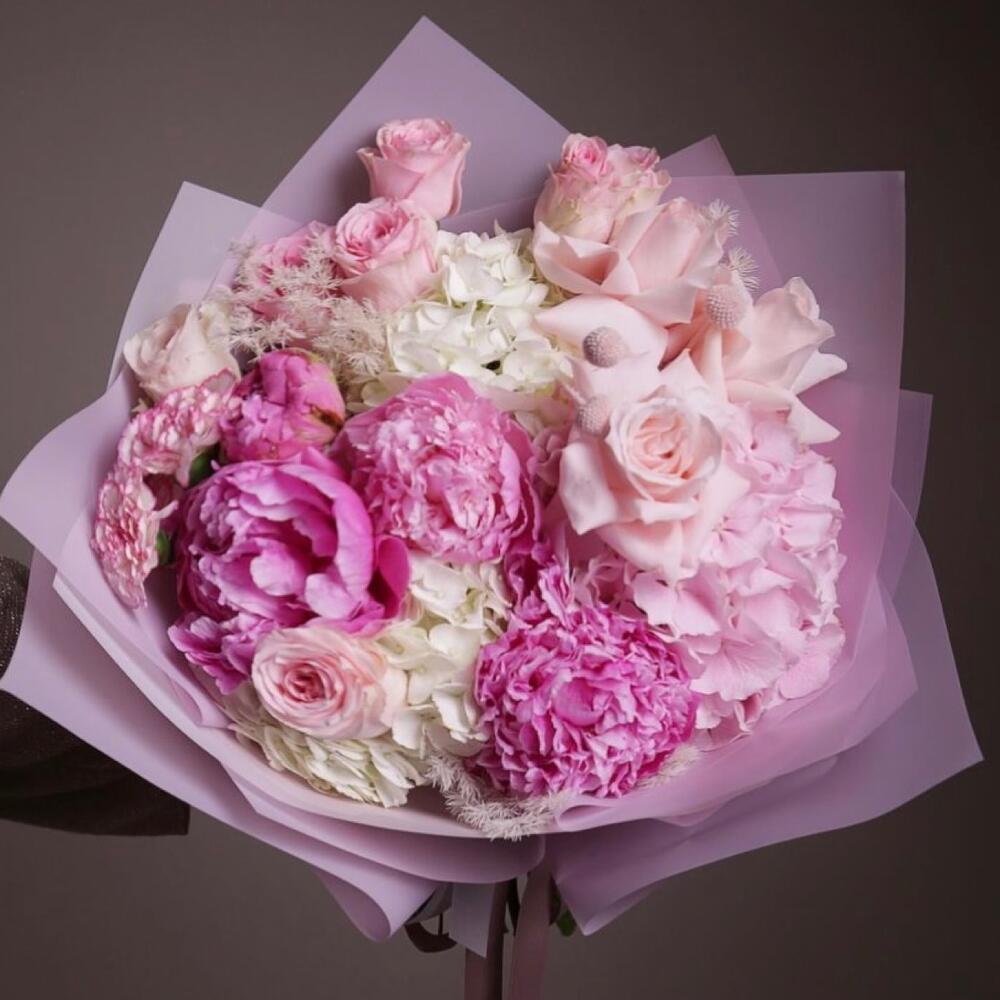 роза ассорти – 9 шт.Гортензия – 4 шт.Пион – 5 шт.Гвоздика – 5 шт.Упаковка дизайнерская – 1 шт.Лента атласная – 2 шт.Открыточка с вашими пожеланиями – 1 шт.хорошее настроение – 100 шт.инструкция по уходу за цветами – 1 шт.коробка переноска – 1 шт.Кризал – 1 шт.