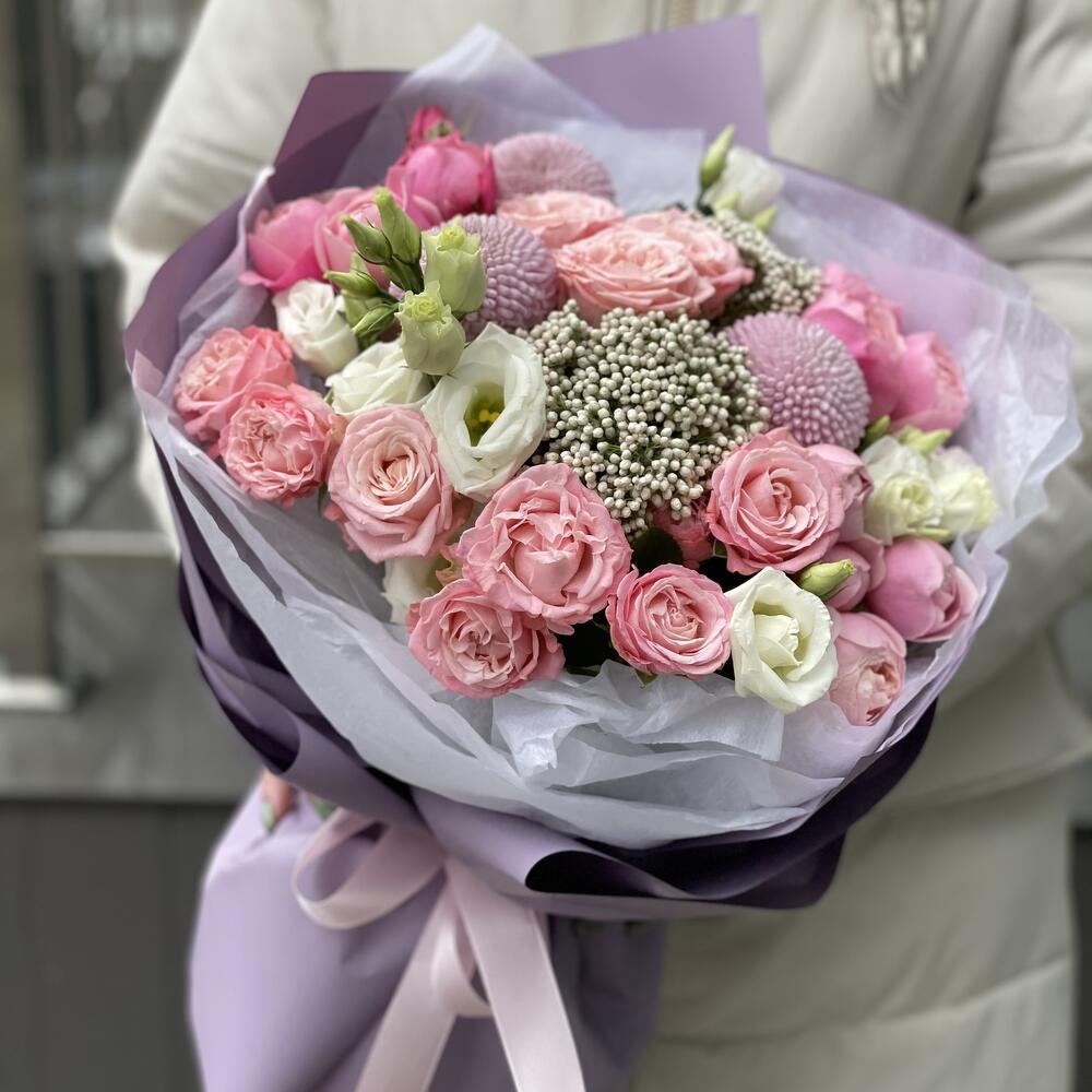Эустома – 3 шт. Хризантема момоко – 3 шт. Озотамнус – 2 шт. Кустовая пионовидная роза – 3 шт. Кустовая роза Бомбастик – 3 шт. Оформление – 1 шт.