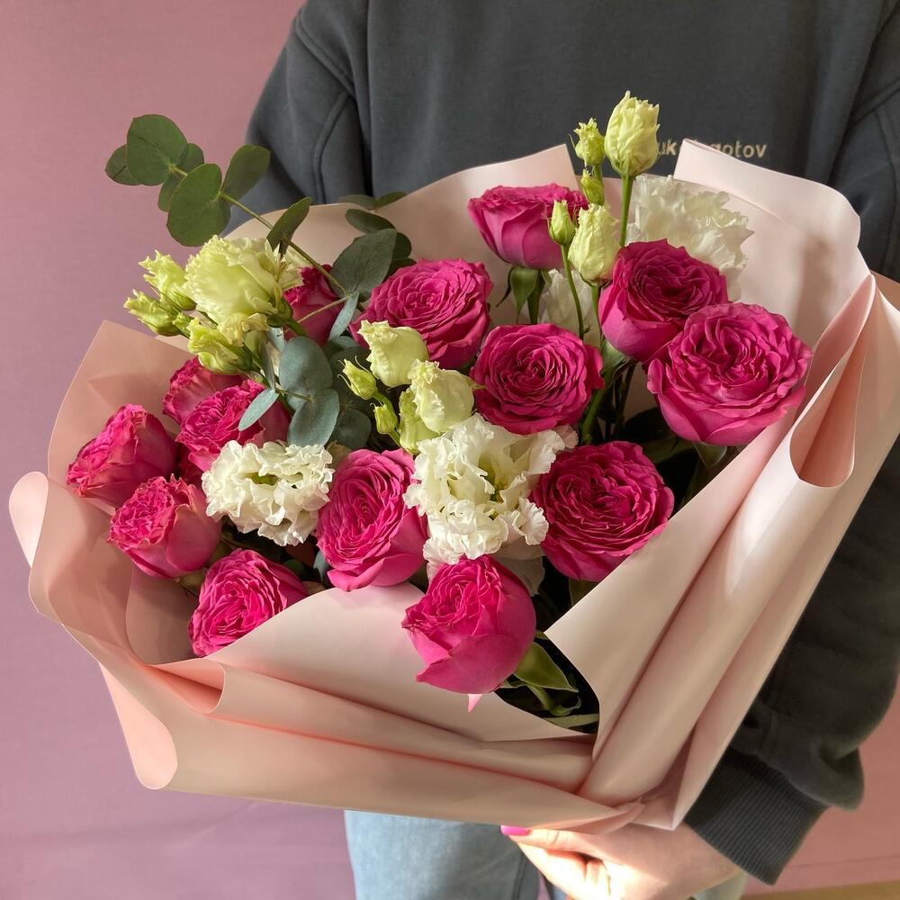Букет с кустовой пионовидной розой и эустомой