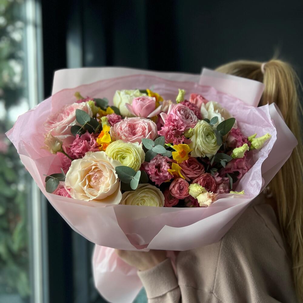 Роза пионовидная – 5 шт.Роза кустовая пионовидная – 4 шт.Эвкалипт – 2 шт.Ранункулюс – 2 шт.Лизиантус – 2 шт.Упаковка дизайнерская – 1 шт.Лента атласная – 1 шт.