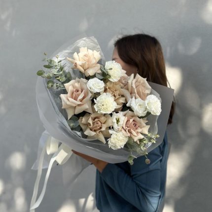 Роза – 13 шт. Гвоздика – 8 шт. Эвкалипт – 2 шт.