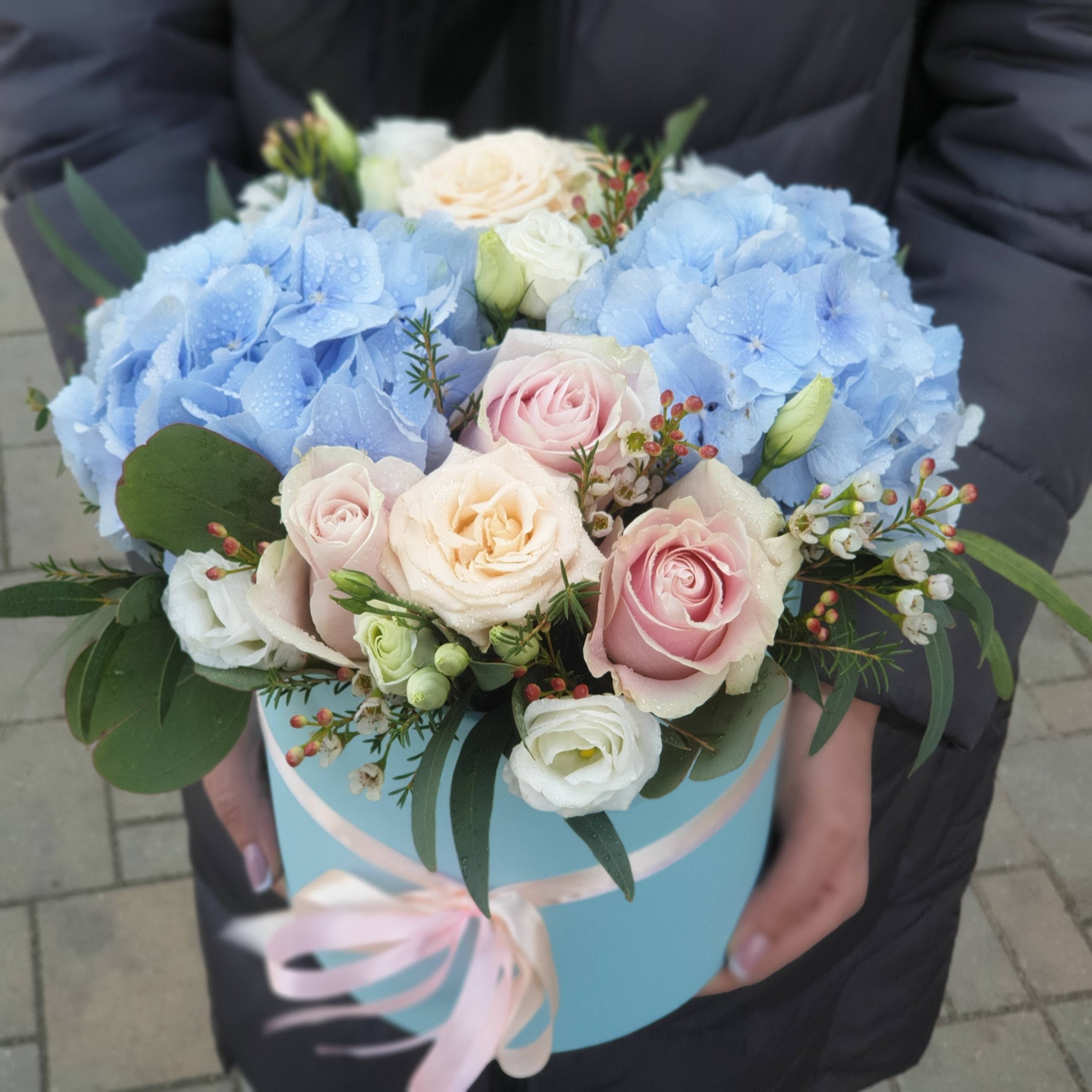 Описание: Голубое небо. Воздушная гортензия прекрасно сочетается с множеством других цветов._x000D_ _x000D_ Мы взяли кустовую розу Жустин, добавили Пинк Мондиаль и Эустому. И завершили цилиндр ароматным хамелациумом и эвкалиптом.