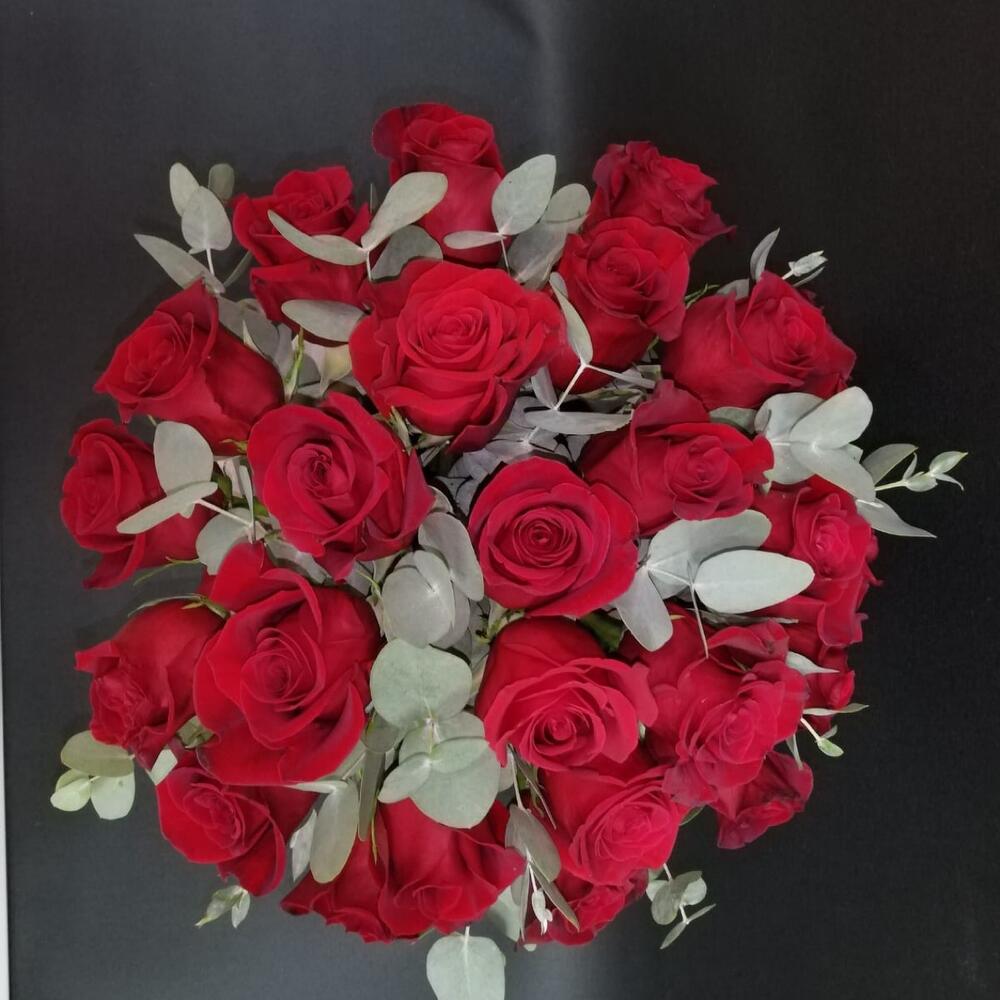 Эвкалипт – 4 шт. Роза – 25 шт. Лента атласная – 4 шт. Коробка шляпная – 1 шт. Оазис флористический – 2 шт. Слюда упаковка – 4 шт.