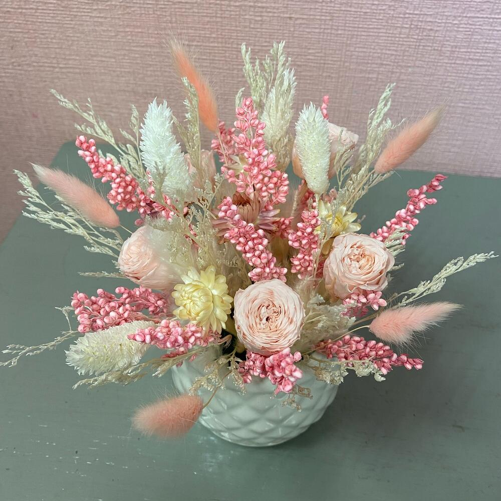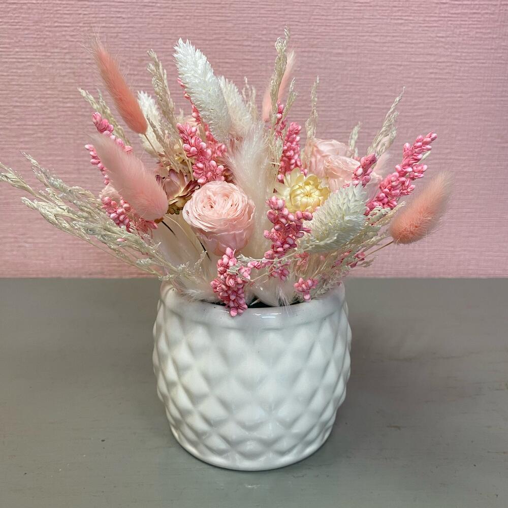 Лимониум – 1 шт.Роза стабилизированная – 5 шт.Лагурус – 5 шт.Кашпо керамическое – 1 шт.Фаларис – 5 шт.Оазис флористический – 1 шт.пампасная трава – 1 шт.гелихризум (сухоцвет) – 5 шт.сорго африканский – 1 шт.